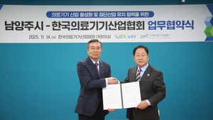 한국의료기기산업협회(회장 김영민)는 14일 남양주시(시장 주광덕)와 의료기기산업 활성화 및 왕숙 도시첨단산업단지 조성을 위한 업무협약(MOU)을 체결했다.이번 협약은 남양주시가 산업계와 맺는 첫 협약으로, 의료기기산업 육성, 전문인력 양성, 투자유치 촉진, 산업 네트워크 확대 등을 통해 지역 산업생태계의 대전환 기반을 마련하기 위해 추진됐다.주요 협력 분야는 △왕숙 도시첨단산업단지 내 의료기기 기업 유치 및 투자 활성화 △의료기기산업 육성 및 판로·해외진출 협력 △첨단제조 기반 구축 및 전문인력 양성 등이다. 양 기관은 산업 경쟁력 강화와 지역경제 활성화를 위한 다양한 협력 사업을 추진할 계획이다.협회는 남양주시가 조성 중인 도시첨단산업단지와 의료기기 클러스터에 산업 네트워크와 정책 지원 역량을 연계해 의료