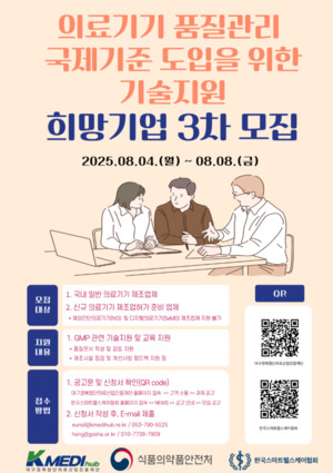 한국혁신의약품컨소시엄은 ‘부처협업형(의약품, 의료기기) 스마트공장 구축 지원사업’ 운영기관으로 선정돼 국내 의약품 및 의료기기 제조 현장 경쟁력 강화와 품질 향상을 위해 스마트공장 솔루션 구축을 지원하고 있습니다.내년 사업 운영 개선 및 예산 확보를 위해 ‘도입기업 참여 의향서 및 설문조사서’를 실시하오니, 관계자 여러분의 많은 관심과 참여 바랍니다.○ 제출기간 : 2025. 11. 28.(금)까지○ 제출방법 - 참여 의향서 : 첨부파일에 따라 작성 후, 이메일 송부(shj@kimc.or.kr) - 설문 조사서 : 구글폼(https://forms.gle/sKsm8VHgLAwLfFea9) 통해 제출○ 문 의 처 : KIMCo 재단 사업운영팀(02-6247-0914, shj@kimc.or.kr)자세한 사항은 한