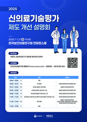 한국보건의료연구원(원장 이재태)은 오는 21일, 한국보건의료연구원 3층 컨퍼런스룸(서울 광진구)에서 ‘신의료기술평가 제도개선 설명회’를 개최한다.이번 설명회는 신의료기술평가 제도 전반의 개선 방향을 공유하고, 의료계·산업계 등 현장 관계자들의 제도 이해를 높이기 위해 마련됐다.그간 신의료기술 선진입-후평가 제도 운영 과정에서 사용 중 안전성 관리 강화와 충분한 임상근거 창출을 위한 개선 방안 마련의 필요성이 의료계와 산업계로부터 지속적으로 제기돼왔다. 이에 보건복지부에서 지난 3월 ‘신의료기술평가에 관한 규칙’을 개정했으며, 이번 설명회에서는 이런 개선 추진 배경과 주요 내용을 안내할 예정이다.△신의료기술평가 정책 방향(복지부 김동현 사무관) △신의료기술평가 관련 제도 소개(신의료기술평가사업본부 김윤정 팀장