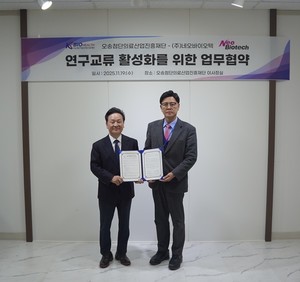 오송첨단의료산업진흥재단(KBIOHealth, 이사장 이명수)은 지난 19일 네오바이오텍(대표 허영구)과 치과용 의료기기의 기술혁신과 내수 확대 및 해외시장 진출을 위한 업무협약(MOU)을 체결했다.양 기관은 이번 협약을 통해 △치과용 의료기기 분야의 연구개발(R&D) 및 기술 협력 △내수 및 글로벌시장 진출 지원 △사업화 촉진을 위한 인허가·인증 협력 등 세 가지 분야에서 전략적 협력체계를 구축했다.KBIOHealth 이명수 이사장은 “양 기관이 보유한 인프라와 기술을 효율적으로 연계해 K-치과용 의료기기산업의 혁신 역량을 강화하고, 글로벌 시장 진출을 체계적으로 지원하겠다”고 전했다. 이어 “첨단의료복합단지의 R&D 및 비임상시험규정(GLP) 인프라를 기반으로 산업 현장에서 필요로 하는 실질적 기업지원 플