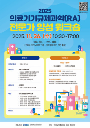한국의료기기안전정보원(원장 이정림)은 오는 26일 서울 구로구 테크노마트 웨딩시티에서 ‘2025년 의료기기 규제과학(RA)전문가 양성 워크숍’을 개최한다.이번 워크숍은 의료기기산업 진출을 희망하는 구직자들에게 실무 중심 정보를 제공하고 직무 이해도를 높여 실제 취업에 필요한 역량을 강화하는 데 초점을 맞추고 있다.주요 프로그램은 △의료기기 업체 채용 동향 △의료기기 산업 분야 AI 활용 사례 △RA기업 정보 및 직무소개 등으로 구성된다. 이를 통해 참가자들에게 실제 취업 과정에서 요구되는 역량을 점검할 기회를 제공한다.또한, 부대행사로 기업 현직자 멘토링 부스가 마련되며, 메드트로닉코리아, 삼성메디슨, 오스템임플란트, 지멘스헬시니어스 등 국내·외 주요 의료기기 기업들이 참여해 회사 소개와 직무에 관해 설명한