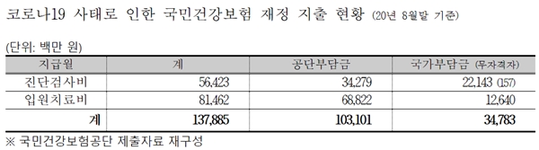 진단검사비로는 지난 3월부터 지난 8월까지 총 564억 2,300만원이 지출됐고, 이중 건보 부담금은 342억 7,900만원, 국가부담금은 221억 4,300만원으로 나타났다. 국가부담금 중 1억 5,700만원은 외국인, 보험료 체납자 등 '건강보험 무자격자'의 진단검사비로 지출됐다.
