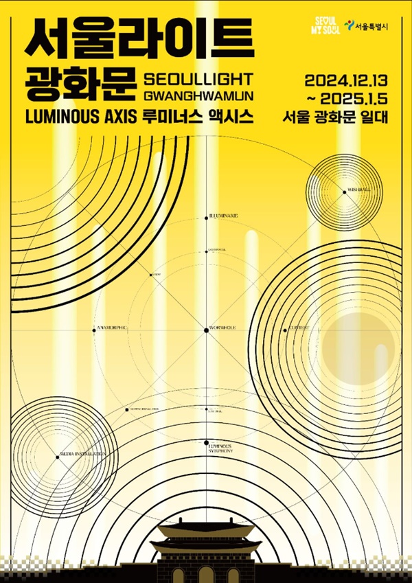 □ 행사소개 : 서울라이트 광화문은 대중이 함께 향유할 수 있는 미디어아트와 문화예술 콘텐츠로 구성된 서울의 대표적인 빛 축제이다. 24 서울라이트 광화문 미디어아트 프로젝트 <루미너스 액시스(Luminous Axis)>는 광화문의 역사적 맥락을 기반으로, 서울의 현재와 미래 비전을 예술적으로 담아내며 미디어아트가 창조하는 빛과 소리의 울림을 전달하고, 관객 참여를 통해 카이로스적 순간을 연출하여 관객들에게 공감각적 체험 기회를 제공한다. 빛의 축은 외곽으로 퍼져 나가며 광화문광장을 더욱 강렬하고 화려한 모습으로 부각시킨다. 광화문 광장 전체를 아름다운 빛의 무대로 탈바꿈시키는 초현실적인 빛의 오케스트라는 관객들에게 잊지 못할 경험을 선사한다.