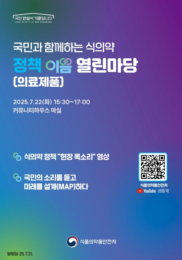 식품의약품안전처에서 식의약 분야 정책과제 발굴을 위해 ‘국민과 함께하는 식의약 정책이음 열린마당’(의료제품)을 개최하오니, 많은 관심과 참여 바랍니다.