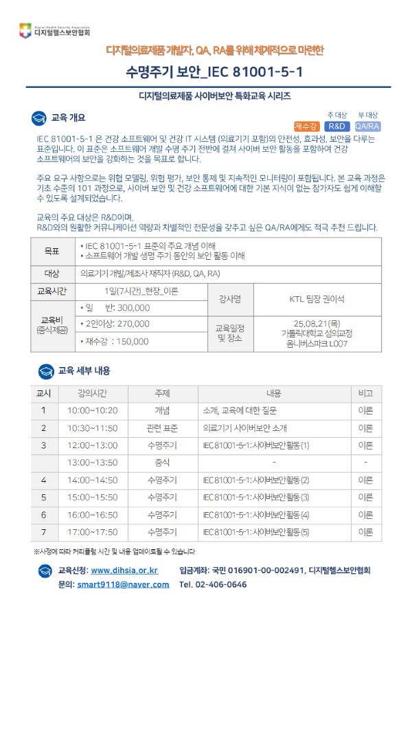 디지털헬스보안협회에서는 디지털의료제품 사이버보안 특화교육 시리즈로, 의료기기 개발자, 제조자 QA, RA를 대상으로 수명주기 보안(IEC 81001-5-1)에 대한 교육을 진행합니다.