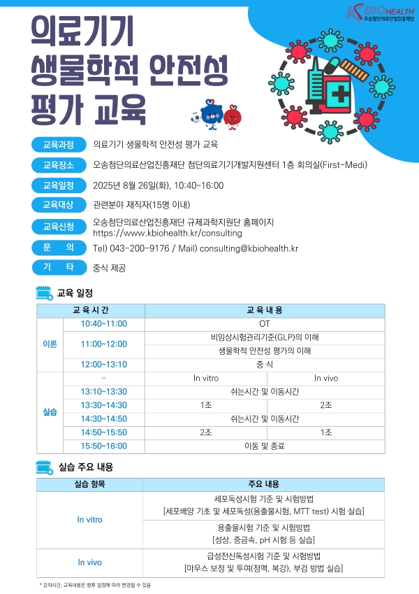- 의료기기 생물학적 안전성 평가교육 : 2025.08.26(화) 10:40~16:00