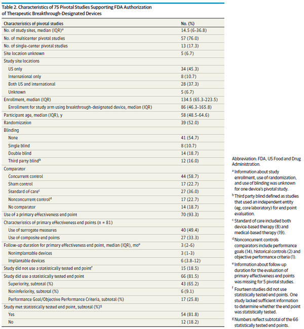 연구 결과에 따르면, BDP는 과거 FDA 프로그램보다 제조업체의 참여를 촉진하고 의료기기 출시를 더 신속하게 촉진한 것으로 나타났다. 1991~2015년에 FDA는 신속 심사(expedited review)를 통해 총 178개 의료기기(연간 평균 7.0개 의료기기)를 승인했다. 반면, BDP에서는 이미 127개 의료기기(연간 평균 14.5개 의료기기)를 승인했으며, 900개 이상의 혁신 지정 의료기기가 아직 시판 전 개발 단계에 있다. 고위험 의료기기의 경우, BDP에 따라 FDA 검토 기간은 이전의 우선 검토 프로그램(Priority Review Program, 평균 1.8년)보다 훨씬 더 짧았다(평균 0.7년). 또한 대부분의 혁신 지정 의료기기에 대한 FDA 검토기간은 의료기기 사용자 수수료(Medical Device User Fee Authorization, MDUFA) 성과목표(performance goal)를 충족했지만, 이런 목표는 주로 혁신 지정이 아닌(즉, 전반적으로 기술 또는 과학적으로 덜 새로운) 의료기기에 대한 기대치를 기반으로 한 것이었다. 일부에서는 제조업체 참여 증가와 검토기간 단축을 더 많은 의료기기에 대한 조기 접근이 환자 결과를 개선할 것이라는 가정 하에 인용할 수 있다. 그러나 이번 연구 결과는 혁신 지정 의료기기에 대한 규제 선택성, 속도, 엄격성 간의 상충관계를 잘 보여준다. 예를 들어, 기존 의료기기와의 실체적 동등성(substantial equivalence) 및 비임상 데이터를 기반으로 510(k) 경로를 통해 승인된 의료기기가 궁극적으로 환자 결과를 개선할지는 여전히 불분명하다. 또한, 많은 확증 임상연구(pivotal study)가 대리 평가변수에 의존했지만 이런 측정치가 임상결과 개선을 항상 정확하게 추정하는 것은 아니다. FDA는 시판 후 데이터 수집을 통해 허가 당시의 잔존 불확실성을 해결하고자 한다고 밝혔다. 그럼에도 불구하고 시판 전 임상시험 없이 허가된 모든 의료기기와 확증 임상연구가 1차 평가변수에 실패한 대부분의 의료기기를 포함해 혁신 지정 의료기기의 60%에 대해 시판 후 연구를 요구하지 않은 것으로 나타났다. FDA가 시판 후 연구를 요구한 경우에도, 이런 연구는 주로 대리 평가변수를 사용했기 때문에 시판 후 데이터가 혁신 지정 의료기기의 안전성 및 효과성을 검증하기에 충분한지 의문이 제기됐다. 이용 가능하고 적절한 확증 임상연구가 부족하면 치료 결정을 내리려는 환자와 의사에게 불확실성이 지속될 수 있다.