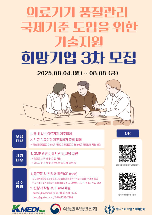 대구경북첨단의료산업진흥재단(케이메디허브)에서는 한국스마트헬스케어협회와 함께 국내 의료기기 제조업체의 GMP 기술지원을 통한 품질관리 수준 향상 및 신뢰성 확보를 위해 식약처 주관 ‘의료기기 품질관리 국제기준 도입을 위한 기술지원’ 사업을 운영하고 있습니다.
