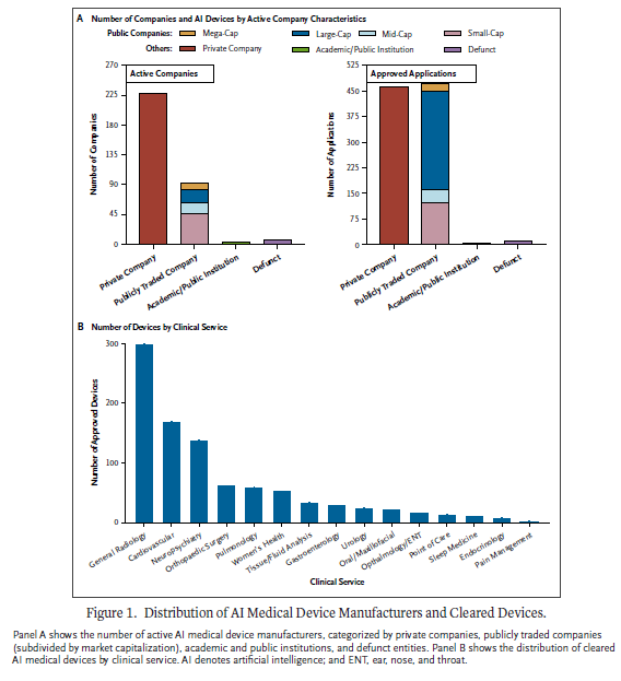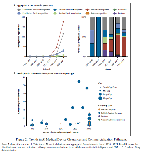 AI의 발전, 변화하는 규제 프레임워크, 시장 역동성에 힘입어 AIMD의 상업적 환경은 급속한 변화를 겪고 있다. 주로 내부 개발 및 상용화에 의해 주도된 승인 건수의 급격한 증가를 보였다. 이런 결과는 헬스케어 제공에서 AI의 변화하는 역할에 대한 중요한 식견을 제공하며, 혁신과 안전성 및 투명성을 균형 있게 조화시키려는 정책입안자, 의료 공급자, 규제기관, 산업계 리더들의 전략수립에 지침을 제공한다. AIMD 승인 건수의 증가 — 1995~2014년에 연간 평균 1.4개에서 2020~2024년에 146개로 — 는 해당 분야의 급속한 성장을 반영한다. 전체적으로 이 연구결과는 특히 민간 및 기존 기업들의 내부 개발이 AIMD 발전에 미치는 역할을 강조한다. 기존 기업들은 고급 DL 소프트웨어나 다모드(multimodal) AI 시스템을 갖춘 의료기기를 자주 인수했으며, 민간 및 소규모 기업들은 일반적으로 단순한 계산 아키텍처를 갖춘 의료기기나 소프트웨어를 인수했다. 이런 차이는 서로 다른 전략적 목표를 반영할 수 있으며, 거대 기업은 복잡한 의료기기 포트폴리오 확장을 추구하는 반면 소규모 기업은 주로 시장진입을 촉진하는 것을 목표로 한다.
