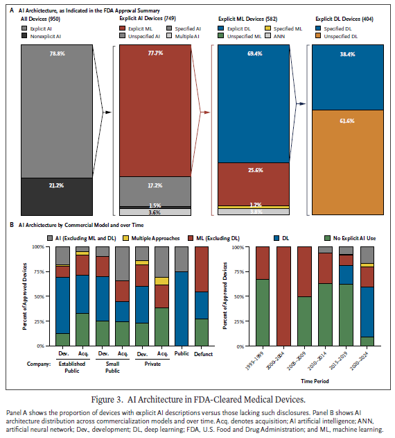 일반 영상의학은 여전히 AIMD의 주요 초점이다. 그러나 심혈관, 신경정신과, 기타 임상 및 외과 분야의 급속한 성장은 AI의 확장되는 다기능성을 강조한다. 이 추세는 전임상 및 임상연구에서 오랫동안 인정받아온 AI 적용의 다양성이 이제 시중에 출시된 승인된 의료기기로 전환되고 있음을 보여준다. 이런 결과는 격려할 만하지만, 표준화된 검토의 필요성을 강조한다. 의료기기의 사용 목적에 따라 FDA 검토 패널을 달리 지정하는 것은 실체적 동등성 또는 승인 기준에 대한 기준과 해석의 변동성을 초래한다. 검토 패널 간 엄격하고 일관된 기준을 수립하는 것이 점점 더 필수적이 되고 있다. 심층학습(deep learning, DL)은 AI의 주요 접근방식으로 부상했으며, 지난 5년간 승인된 모든 AIMD의 과반수를 차지한다. 그러나 DL 의료기기의 1/3만이 사용된 특정 테크닉을 공개하고 있어, 이런 접근방식이 제기하는 독특한 도전과제를 해결하기 위해 더 큰 투명성이 필요하다. AI 사용 기술을 명시적으로 언급하지 않은 의료기기 비율은 2015~2019에 62.4%에서 2020~2024년에 8.9%로 감소했지만, 모든 AIMD의 61.7%는 여전히 AI 방법론에 대한 상세한 설명이 부족하다. 이 명확성 부족은 이런 기술의 해석가능성과 책임성에 대한 우려를 제기하며, 승인과 시판 후 성능 간의 격차와 관련된 이슈를 악화시킬 수 있다.