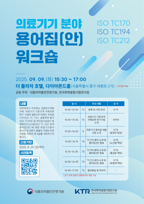이번 워크숍에서는 ‘외과용 기구(ISO TC 170), 생물학적 평가(ISO TC194), 진단검사실검사 및 체외진단시스템(ISO TC 212) 분야 용어집(안)’에 대한 의견수렴을 진행할 예정이오니, 관계자 여러분의 많은 관심과 참여 바랍니다.