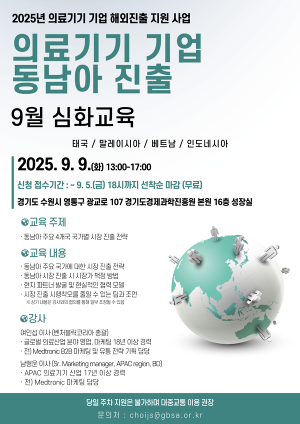 경기도경제과학진흥원에서는 ‘2025년 의료기기 기업 해외진출 지원 사업’의 일환으로 동남아 주요 4개국(태국, 말레이시아, 베트남, 인도네시아)의 시장 진출 전략에 대한 심화교육을 실시합니다. 관계자분들의 많은 관심과 참여 바랍니다.