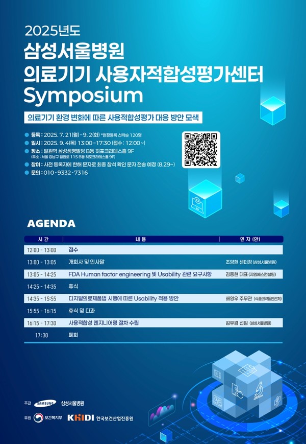 삼성서울병원에서는 복지부 ‘의료기기 사용적합성 인프라 구축’ 사업의 일환으로 ‘2025년 의료기기 사용자적합성평가센터 심포지엄’을 다음과 같이 개최합니다.