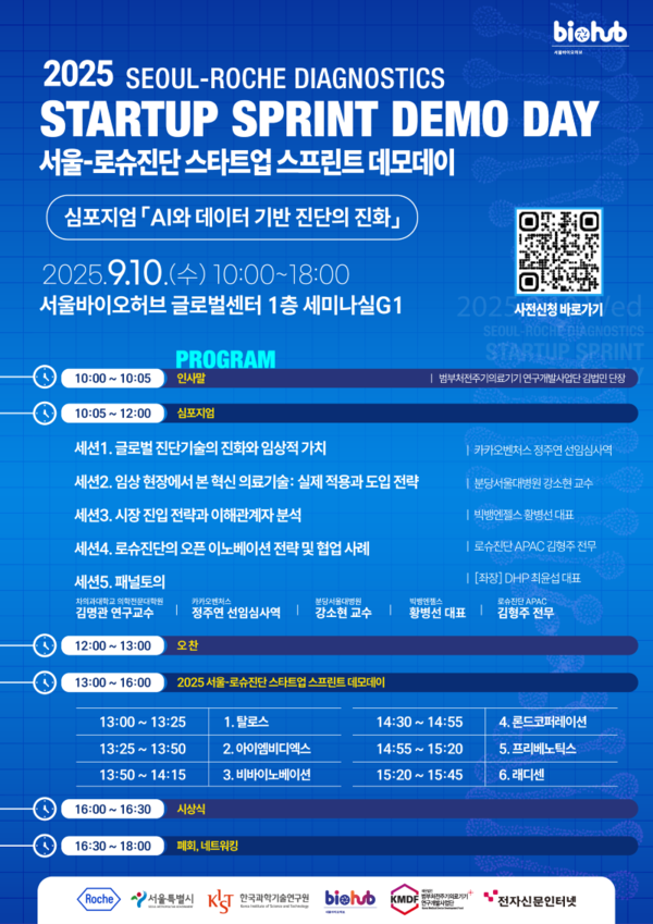 한국과학기술연구원 서울바이오허브사업단에서 ‘서울-로슈진단 스타트업 스프린트 데모데이’(심포지엄 : AI와 데이터 기반 진단의 진화)를 개최합니다.