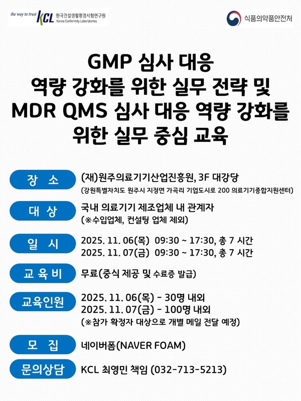 한국건설생활환경시험연구원(KCL)은 2025년도 식품의약품안전처 주관 ‘의료기기 품질관리 국제기준 도입을 위한 기술지원’ 사업의 수행 기관으로서 국내 의료기기 제조업체 관계자분들을 대상으로 GMP 심사 대응 역량 강화를 위한 실무 전략 및 MDR QMS 심사 대응 역량 강화를 위한 실무 중심 교육을 실시합니다.