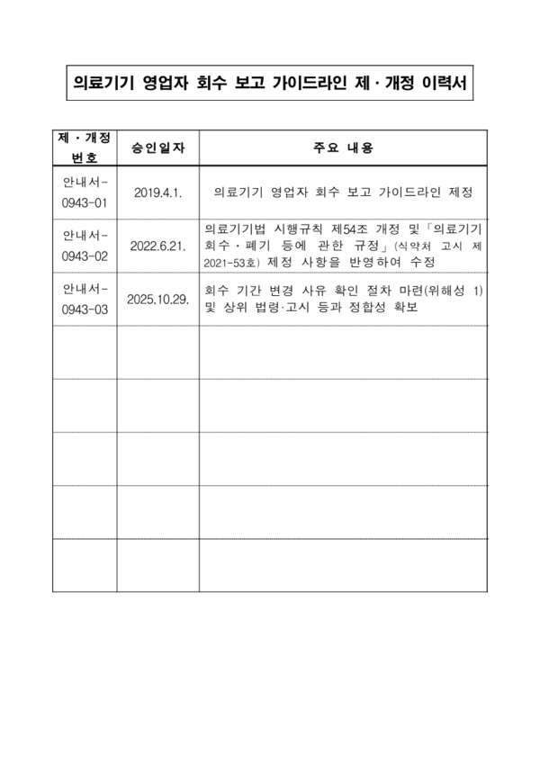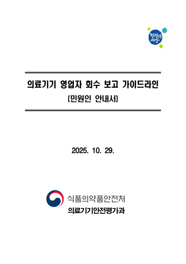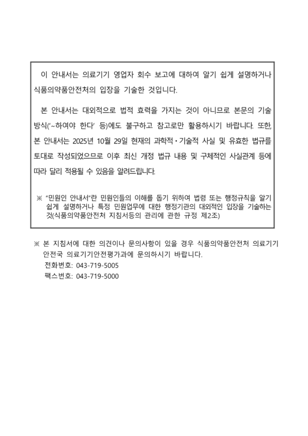 식품의약품안전처(의료기기안전평가과)에서 회수 기간 변경 사유 확인 절차 마련(위해성 1) 및 상위 법령·고시 등과 정합성 확보를 위해 의료기기 영업자 회수 보고 가이드라인(민원인 안내서)를 개정하였습니다. 관련 업무에 참고하시기 바랍니다.