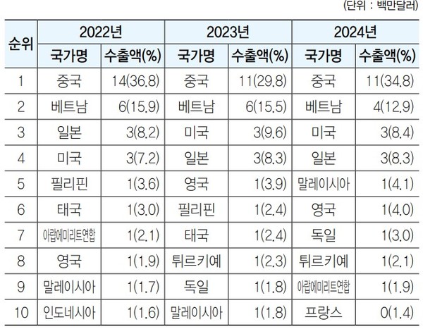 국가별로는 중국 1억 6,600만달러(42.5%), 러시아 6,000만달러(15.3%), 튀르키예 2,900만달러(7.4%) 순으로, 최근 3년간 수출 상위국 순위에는 큰 변동이 없는 것으로 나타났다.