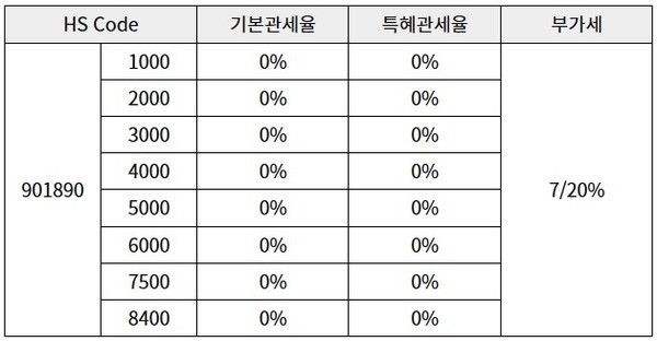 우크라이나 의료기기(HS 코드 901890) 관세율은 0%다. 부가세는 경우에 따라 7%, 20%로 부과된다. 2014년 9월 발효된 규정 No.410에 따라, 특정 UKTZED 코드에 해당하는 의료기기는 구매 또는 수입 시 기존 VAT 세율과 관계없이 7%의 VAT 세율이 적용된다. 다만, 세관 통관 과정에서 제품이 해당 조건을 충족하지 않을 경우 20%의 부가세가 부과될 수 있다.