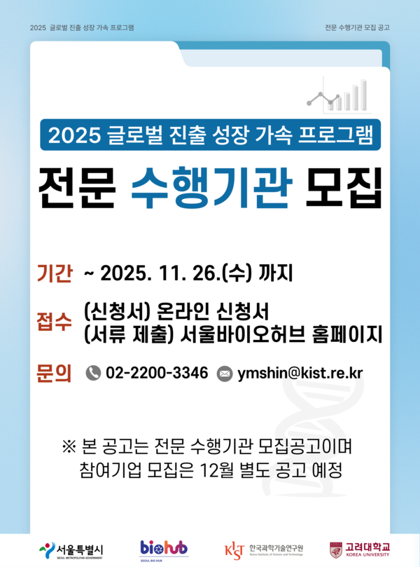 서울바이오허브에서는 국내 바이오·의료 창업기업의 해외 진출 활성화를 위해 글로벌 진출 성장 가속 프로그램을 운영할 전문 수행기관을 모집하오니 많은 관심과 참여 바랍니다.